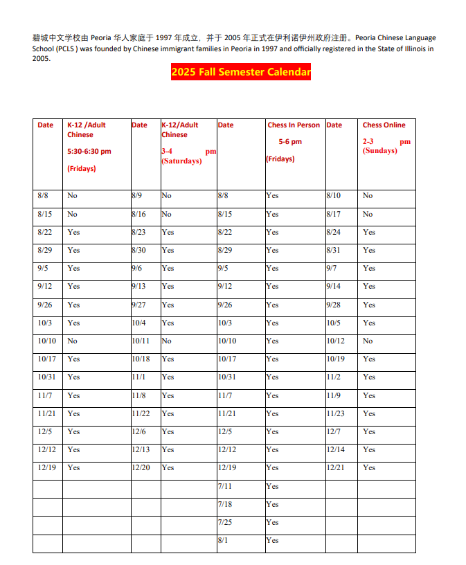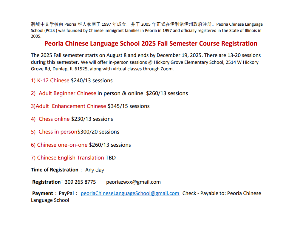 Peoria Chinese Language School 2025 Fall Semester Registration Open Now